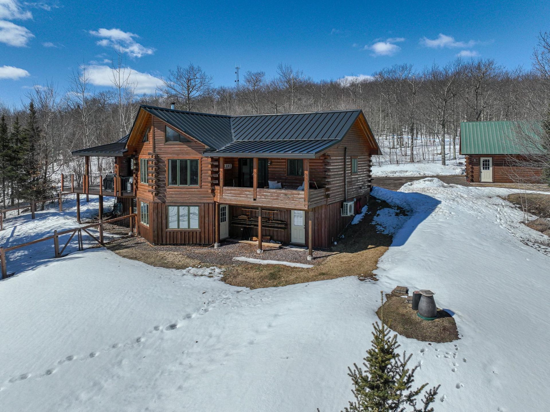 Nestled in the woods with panoramic Lake Superior and North Shore views, this stunning log home blends privacy with rustic charm. Vaulted ceilings and an open layout create a bright, inviting feel, complemented by hardwood floors, a tiled entry, and a cozy living room with a Jotul wood stove. The kitchen features hickory cabinetry and a butcher block island, opening to a dining area with access to a covered porch?perfect for taking in the views.The main level includes a mudroom with laundry, primary bedroom, full bath, second bedroom, and a walkout office/den. The lower level offers great flexibility with an additional bedroom or office, sauna within a ¾ bath, in-floor heat, and walkout access?plus room to expand living or recreation space.Outside, enjoy a wraparound deck, fenced dog run, and nearly 20 acres with selectively thinned trees for long-term forest health. A heated, insulated two-car garage with a semi-finished loft adds even more potential.